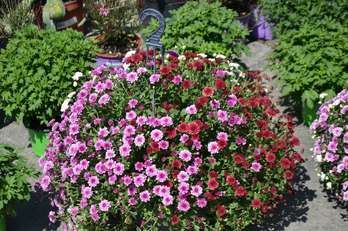 В садовом центре Сочи большой выбор различных расцветок шаровидных хризантем мультифлора в ампельных кашпо. Это особая и очень популярная разновидность декоративных хризантем. С осени и до наступления холодов растение порадует вас обильным цветением и может ярко украсить входные группы домов, балконы, веранды, беседки и террасы.